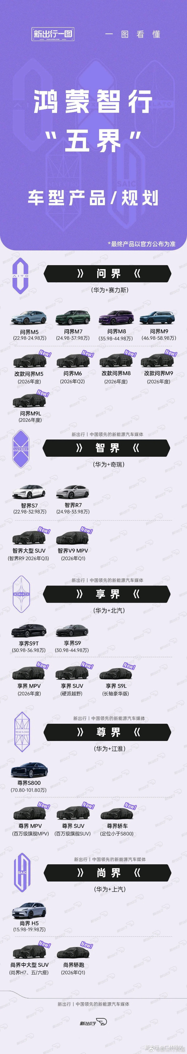 【CNMO科技消息】根据“新出行”整理的鸿蒙智行“五界”车型产品/规划图,华为联合赛力斯、奇瑞、北汽、江淮、上汽五大车企打造的问界、智界、享界、尊界、尚界五大品牌,已形成覆盖不同价位和细分市场的新能源车型矩阵。以下为各品牌现有车型及2026年规划概览: