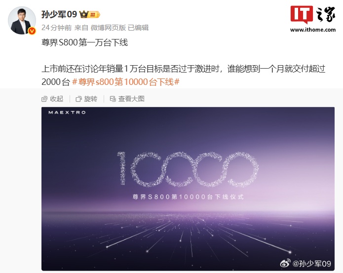 IT之家 12 月 16 日消息,据博主 @孙少军09 分享,鸿蒙智行尊界 S800“时代旗舰”轿车第 10000 台已下线。根据计算,尊界 S800 从发布到此次 1 万台车下线用时约 200 天(尊界 S800 于今年 5 月 30 日发布)。